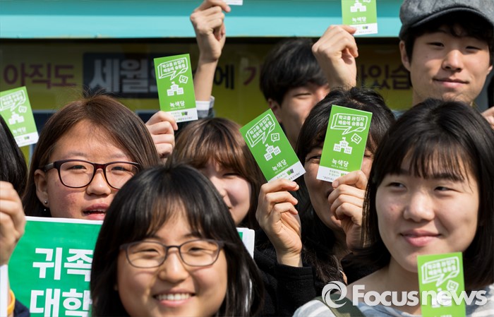 (서울=포커스뉴스) 21일 오전 서울 광화문 광장에서 열린 녹색당 교육(배움) 공약 발표 기자회견에 참석한 학생들이 '학교를 뒤집자, 배움에 숨통을'이 적힌 소형 손팻말을 들고 있다.
