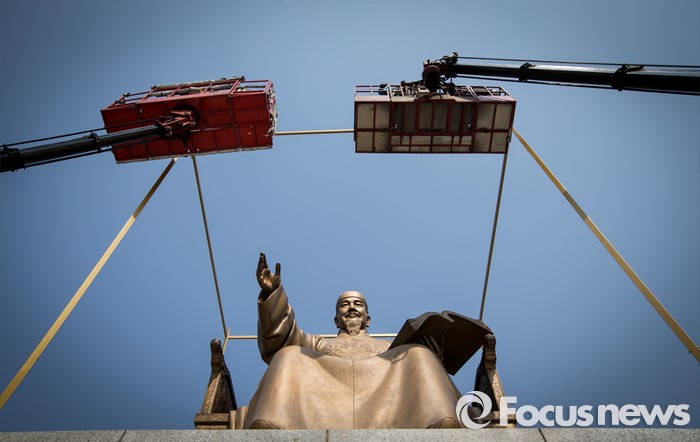(서울=포커스뉴스) 21일 오전 서울 광화문 광장 세종대왕상에 한ㆍ불수교 130주년 기념 미술작품 '킹 오브 사인스'가 설치되고 있다.