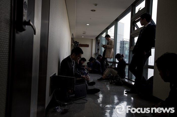(서울=포커스뉴스) 김종인 더불어민주당 비상대책위 대표의 비례대표 2번 공천으로 김종인 대 친노, 범주류 간 논란이 거세지고 있는 21일 오후 서울 종로구 김 대표의 사무실 앞에서 취재진들이 몰리고 있다.