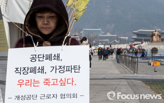 (서울=포커스뉴스) 21일 오전 서울 광화문 광장에서 개성공단 근로자 협의회의 한 관계자가 개성공단 폐쇄에 따른 정부의 보상을 촉구하는 팻말을 몸에 두르고 있다.