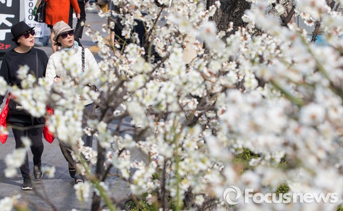 (서울=포커스뉴스) 봄 기운이 완연한 21일 오후 서울 종로구 탑골공원 인근에서 시민들이 봄볕을 머금고 만개한 매화를 바라보고 있다.