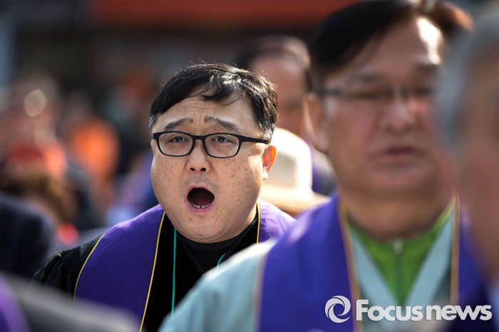 (서울=포커스뉴스) 21일 오후 서울 중구 덕수궁 대한문 앞에서 한국기독교 장로회 총회 '고난당하는 민주주의를 위한 시국기도회'가 열리고 있다.