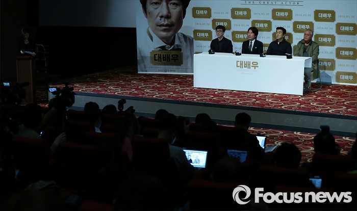 (서울=포커스뉴스) 21일 오후 서울 광진구 건대입구 롯데시네마에서 열련 영화 '대배우' 언론시사회에 영화감독 석민우(왼쪽부터), 배우 오달수, 윤제문, 이경영이 취재진에게 질문을 받고 있다.