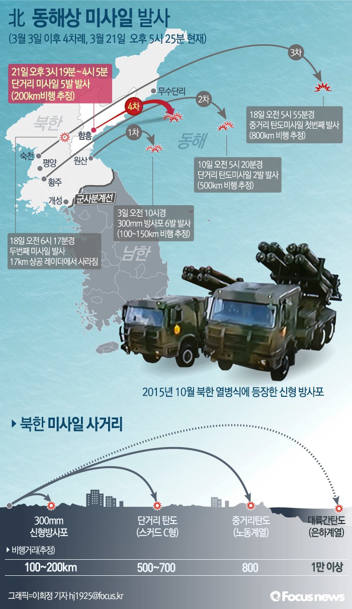 (서울=포커스뉴스) 합동참모본부는 “북한이 21일 오후 3시 19분쯤 함경남도 함흥 북방 일대에서 동해상으로 불상의 단거리 발사체 4발을 발사했다”고 이날 밝혔다. 이어 4시 5분경 1발이 추가로 발사되면서 북한이 쏜 단거리 발사체는 총 5발로 파악됐다. 북한은 3월 3일부터 4차례에 걸쳐 무력도발 중이다.