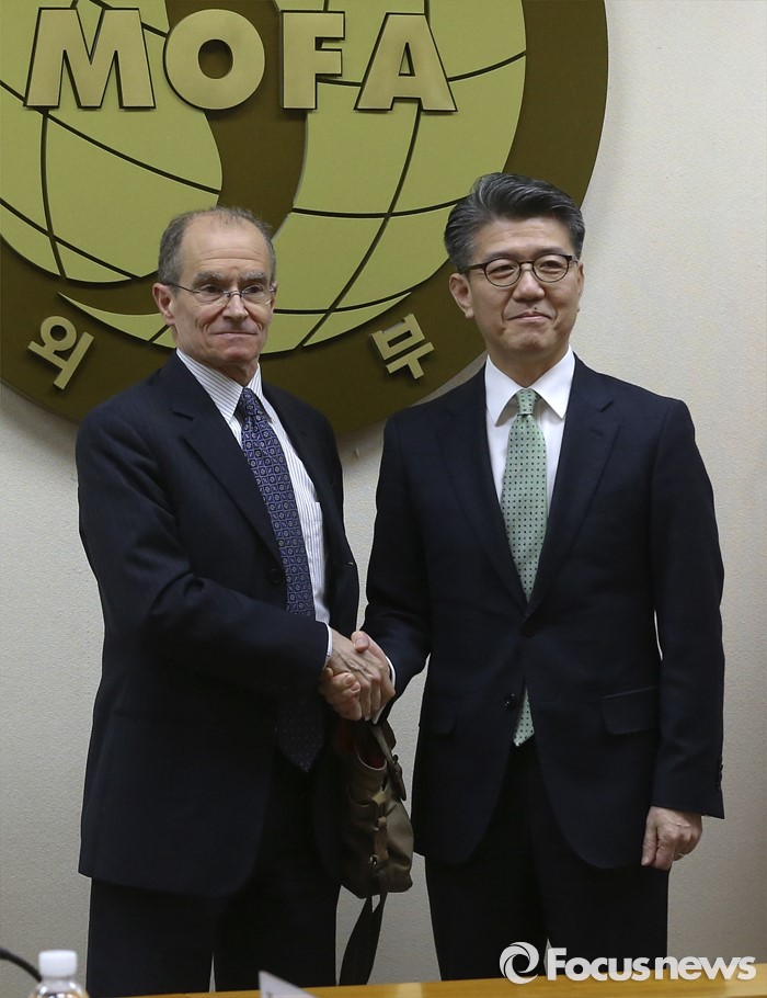 (서울=포커스뉴스) 21일 오후 서울 종로구 외교부 청사에서 열린 한미 고위급 대북제재 협의에서 대니얼 프리드 미국 국무부 제재정책조정관과 김홍균 한반도평화교섭본부장이 악수를 하고 있다.