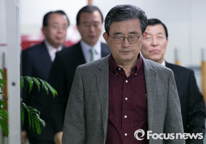 (서울=포커스뉴스) 이한구 새누리당 공천관리위원장과 공관위원들이 21일 오후 서울 여의도 당사에서 20대 총선 여론조사 경선 결과 발표를 위해 입장하고 있다. 왼쪽부터 김회선, 홍문표 위원, 이 위원장, 황진하 부위원장.