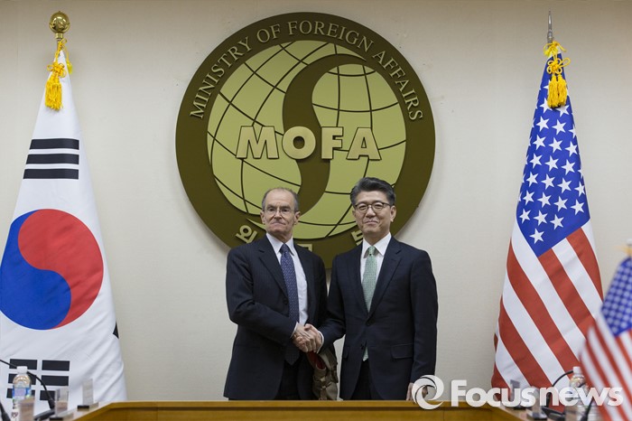 (서울=포커스뉴스) 대니얼 프리드 미 국무부 제재정책조정관(왼쪽)과 김홍균 한반도평화교섭본부장이 21일 오후 정부서울청사 별관 외교부 17층 양자회의실에서 열린 '한미 고위급 대북제재 협의'에 참석해 악수하고 있다.