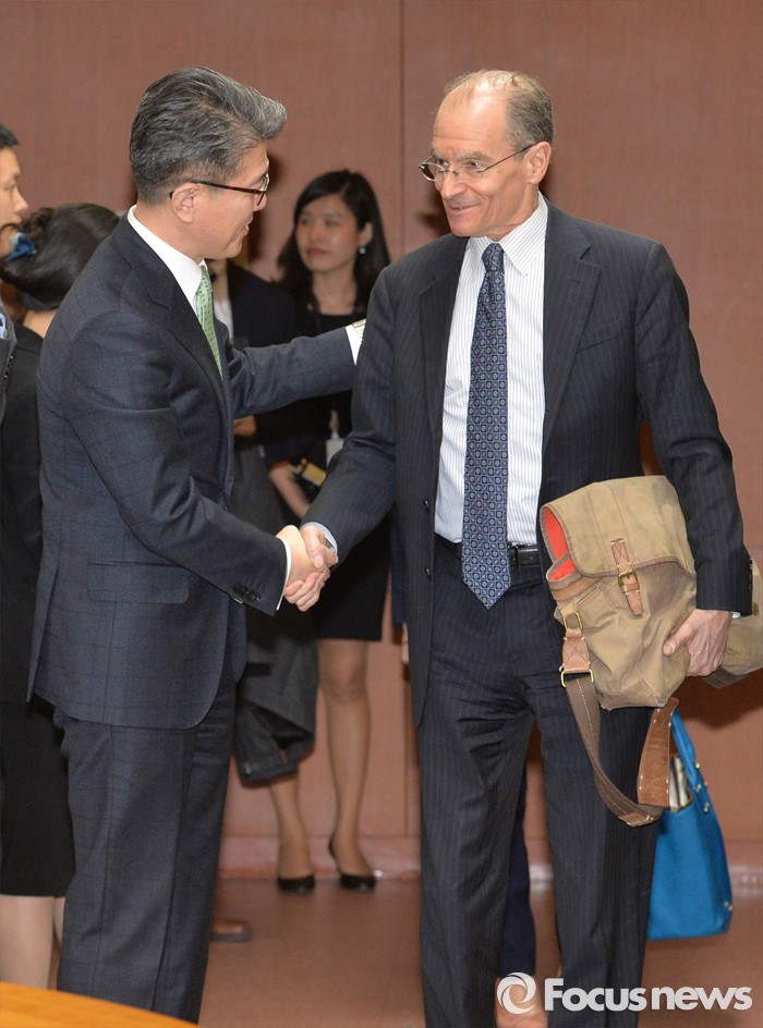 (서울=포커스뉴스) 21일 서울 종로구 도렴동 외교부 청사에서 열린 한미 고위급 대북제재 협의에 참석한 한미 양국 6자회담 수석대표인 김홍균(왼쪽) 외교부 한반도평화교섭본부과 대니얼 프리드 국무부 제재정책 조정관이 악수를 하고 있다. 한미 간 제재협의 형식으로 처음 갖는 이번 회동에서 양국은 전방위 대북압박 강화를 논의했다.