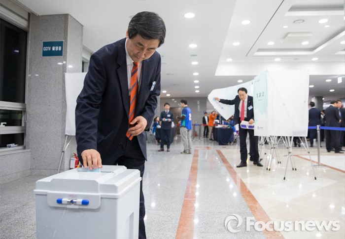 (서울=포커스뉴스) 비례대표 선정을놓고 김종인 비대위 대표가 당무를 거부하는 등 더불어민주당의 내홍이 계속되고 있는 가운데 22일 오전 서울 여의도 국회 의원회관에서 열린 중앙위원회의가 끝난 후 이종걸 원내대표가 투표를 하고 있다.