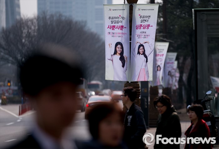 4월13일(수)투표 (06:00~18:00)20대 총선을 30일 앞둔 14일 오전 서울 여의도 국회 인근 가로등에 '아름다운 선거 홍보대사'인 그룹 AOA의 설현을 모델로 제작된 서울시선거관리위원회 현수기가 게시되어 있다. 2016.03.14 박동욱 기자