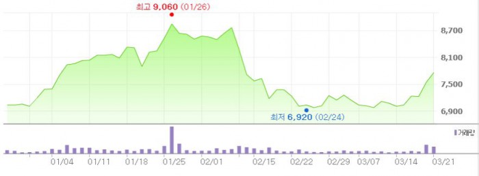 쇼박스는 중국 화이브라더스와 계약한 6편 중 올해 1편, 내년에 2편을 개봉할 예정이다. 첫 영화 '뷰티풀 액시던트'는 오는 6~8월경 중국에서 개봉한다.최근 3개월간 쇼박스 주가 추이 <그래픽출처=네이버>