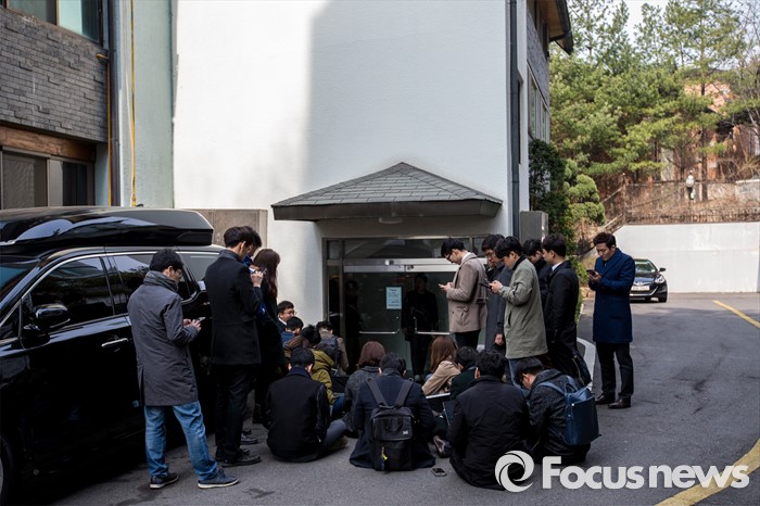 (서울=포커스뉴스) 더불어민주당의 비상대책위원회의가 오후 3시로 연기된 22일 오전 서울 종로구 김종인 비상대책위 대표 자택 앞에 취재진이 몰려 있다. 앞서 김성수 대변인은 이날 오전 11시에 열리는 비대위에 김 대표가 참석하며 당무에 복귀한다고 밝혔으나 김 대표는 자택에 머물며 모습을 드러내지 않고 있다.