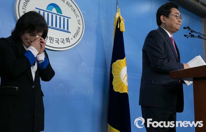 (서울=포커스뉴스) 20대 총선을 앞두고 공천 배제(컷오프)된 전병헌 더불어민주당 의원이 22일 오전 서울 여의도 국회 정론관에서 대선승리를 위한 백의종군 선언 기자회견을 하고 있다. 왼쪽은 전 의원 아내 조영아 씨.