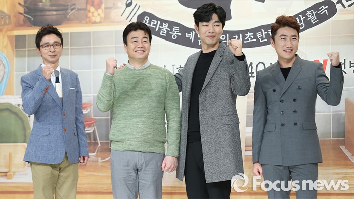 (서울=포커스뉴스) 22일 오전 서울 영등포구 타임스퀘어 아모리스홀에서 열린 tvN '집밥 백선생2' 제작발표회에 참석한 출연진이 포토타임을 갖고 있다. 왼쪽부터 김국진, 백종원, 이종혁, 장동민.