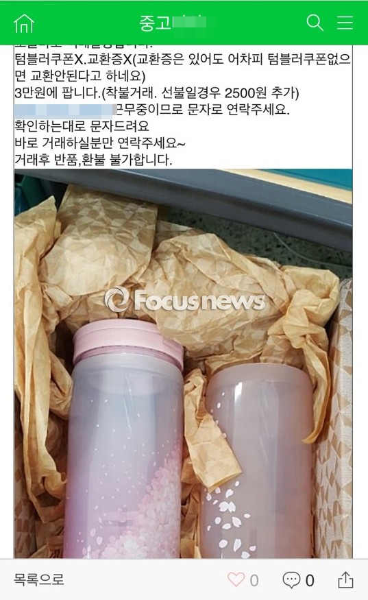 실제로 중고물건을 사고파는 온라인 커뮤니티에는 이날 오전부터 판매를 시작한 벚꽃 텀블러를 되파는 게시글이 속속 올라오고 있다. 되팔기 판매자들은 매장에서 1개당 4900원에 판매 중인 머들러를 5000원에서 최대 1만원까지 올려 내놓고 있다.