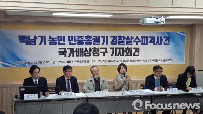조영선 민변 사무총장은 “국가를 상대로 청구하는 이유는 우리 사회에서 경찰과 검찰의 존재를 신뢰할 수 없다는 뜻”이라며 “소장 제출 원고는 백남기씨와 배우자 박순례씨, 그리고 백도라지씨를 포함한 자녀 세 명 등이 될 것”이라고 밝혔다.