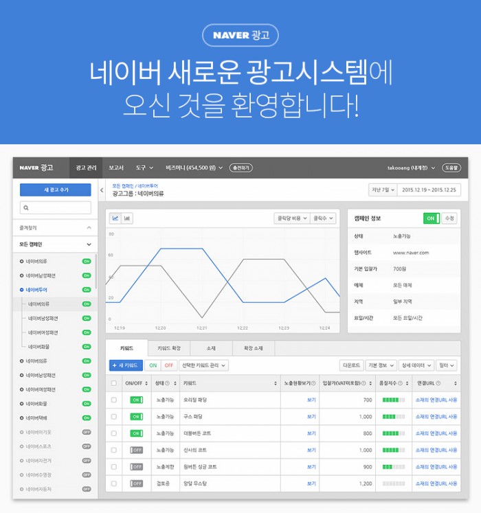 또, 광고 목적에 따라 예산이나 기간 등을 설정해두는 '캠페인' 단위를 신설하고, 광고주가 목적에 따라 유연하게 광고를 운영할 수 있게 했다. 의류를 판매하는 광고주가 상품 할인 이벤트를 기획하고 있다면 '세일 캠페인'을 설정하고 이에 맞는 광고 채널과 검색어, 문구를 별도로 운영하는 식이다. 향후 '파워컨텐츠'나 '상품광고', '쇼핑광고' 등의 시스템도 통합되면 한 번 설정한 캠페인을 원하는 광고 상품에 선택, 적용할 수 있게 된다.