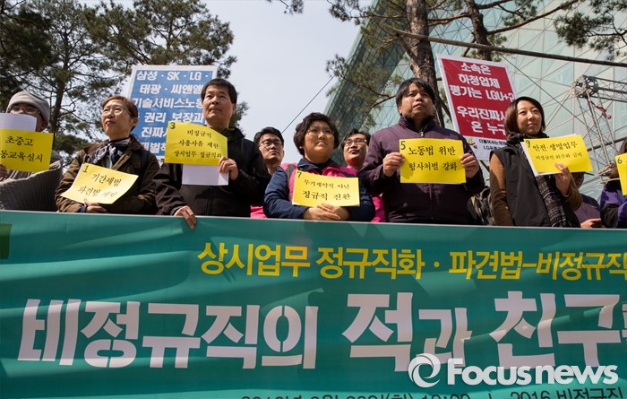 (서울=포커스뉴스) 22일 오전 서울시청 인근에서 열린 2016 비정규직 총선연대 발족식에 참석한 비정규직 노동자들이 정규직 전환, 파견법 폐지 등 요구사항이 적힌 손팻말을 들고 있다.