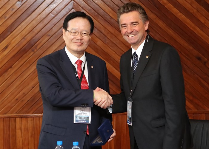 (서울=포커스뉴스) 정의화 국회의장이 21일 오후(현지시각) 잠비아에서 열린 IPU(Inter-Parliamentary Union, 국제의회연맹) 총회에 참석해 헤라르도 안드레스 아마리아 데 니꼴라(Gerardo andres amarilla de nicole) 우루과이 하원의장과 면담에 앞서 기념촬영을 하고 있다. <사진제공=국회>
