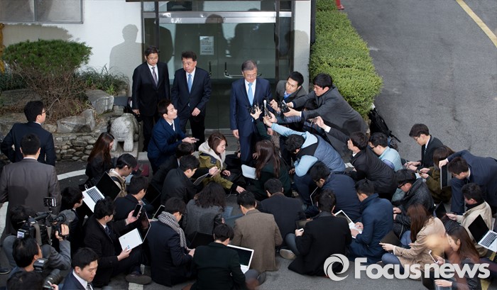 (서울=포커스뉴스) 문재인 더불어민주당 전 대표가 22일 오후 서울 종로구 구기동의 김종인 비상대책위원회 대표와 면담 후 김 대표 자택을 나서며 취재진 질문에 답하고 있다.