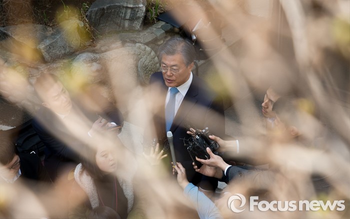 (서울=포커스뉴스) 문재인 더불어민주당 전 대표가 22일 오후 서울 종로구 구기동의 김종인 비상대책위원회 대표와 면담 후 김 대표 자택을 나서며 취재진 질문에 답하고 있다.