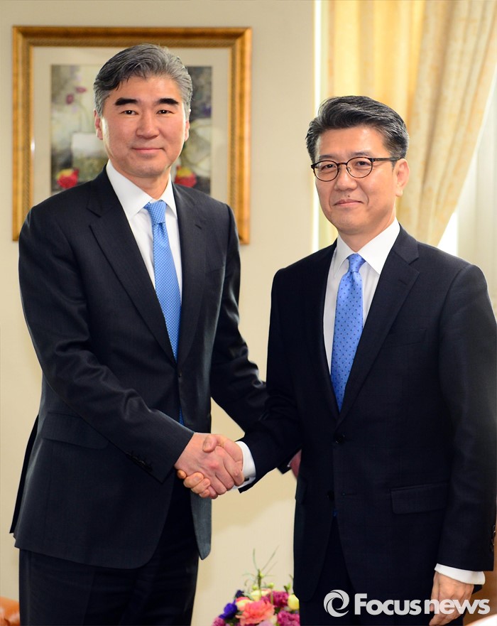 (서울=포커스뉴스) 성김(왼쪽) 국무부 대북정책특별대표와 김홍균 한반도평화교섭본부장이 22일 서울 종로구 외교부에서 열린 '한·미 북핵 6자회담'에 참석해 인사를 나누고 있다.