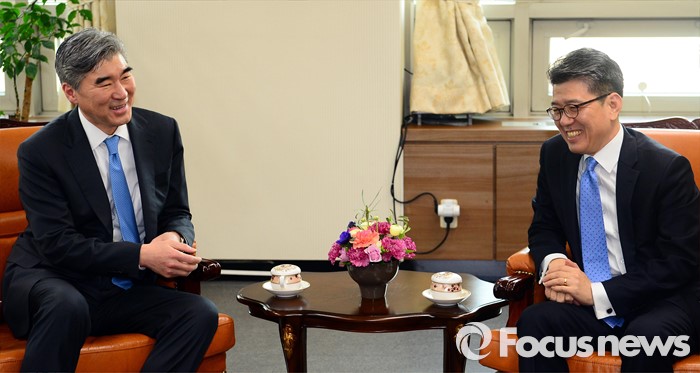 (서울=포커스뉴스) 성김(왼쪽) 국무부 대북정책특별대표와 김홍균 한반도평화교섭본부장이 22일 서울 종로구 외교부에서 열린 '한·미 북핵 6자회담'에 참석해 대화를 나누고 있다.