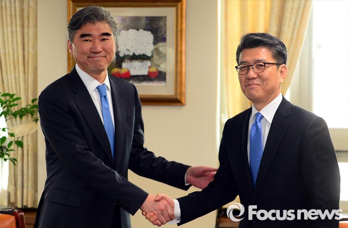(서울=포커스뉴스) 성김(왼쪽) 국무부 대북정책특별대표와 김홍균 한반도평화교섭본부장이 22일 서울 종로구 외교부에서 열린 '한·미 북핵 6자회담'에 참석해 인사를 나누고 있다.