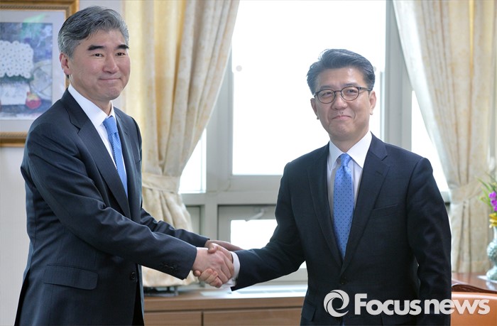 (서울=포커스뉴스) 성김(왼쪽) 국무부 대북정책특별대표와 김홍균 한반도평화교섭본부장이 22일 서울 종로구 외교부에서 열린 '한·미 북핵 6자회담'에 참석해 인사를 나누고 있다.