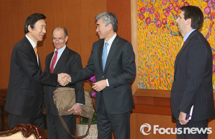 (서울=포커스뉴스) 윤병세 외교부 장관이 22일 오후 서울 종로구 외교부에서 성김 미 국무부 대북정책특별대표와 인사를 나누고 있다.