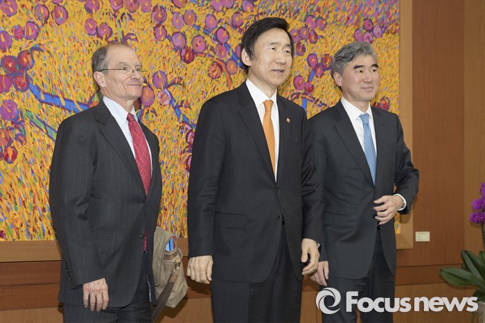 (서울=포커스뉴스)대니얼 프리드(왼쪽부터) 미 국무부 재정책조정관, 윤병세 외교부 장관, 성김 미 국무부 대북정책특별대표가 22일 오후 정부서울청사 별관 외교부에서 만나고 있다.