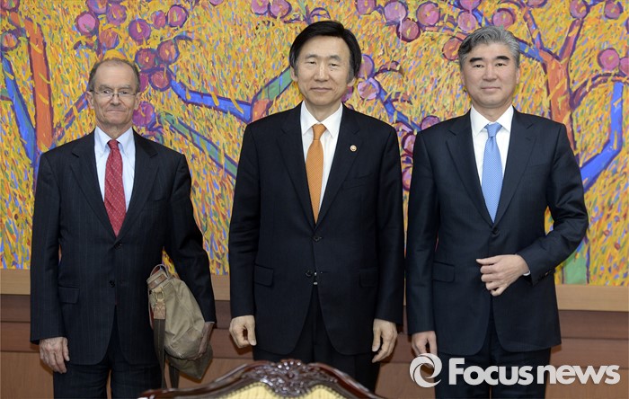 (서울=포커스뉴스)윤병세 외교부 장관이 22일 오후 서울 종로구 외교부 청사애서 대니얼 프리드 제재정책조정관, 성김 미 대북정책 특별대표와 접견, 기념촬영을 하고 있다.
