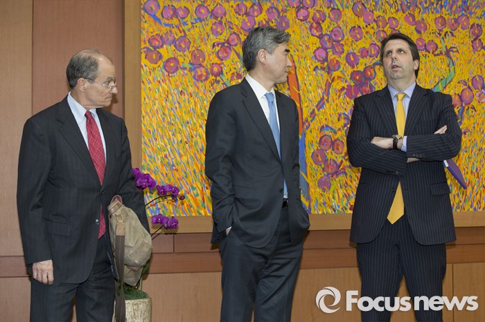 (서울=포커스뉴스)대니얼 프리드(왼쪽부터) 미 국무부 제재정책조정관, 성김 미 국무부 대북정책특별대표, 마크 리퍼트 주한미국대사가 22일 오후 서울 종로구 외교부에서 만나 윤병세외교부 장관을 만나기 앞서 대화를 나누고 있다.