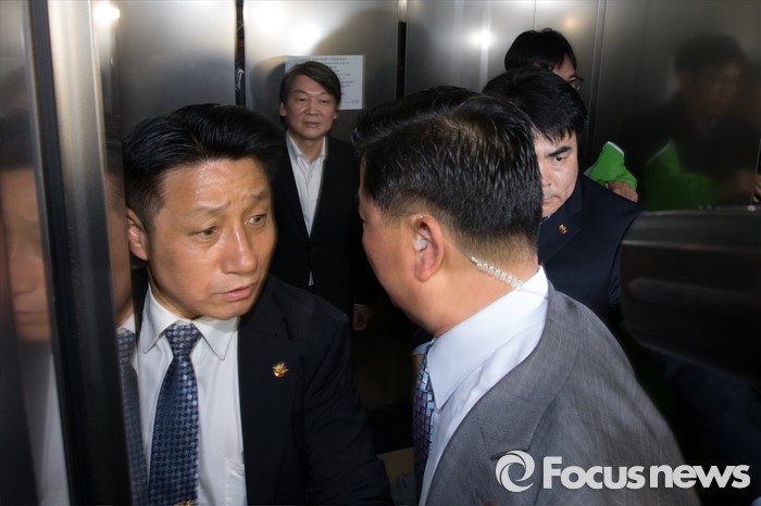 (서울=포커스뉴스) 22일 오후 서울 마포구 국민의당 당사에서 안철수 국민의당 상임공동대표가 PI론칭 발표를 마친 후 브리핑실을 나서다 공천에서 떨어진 전 농구선수 김해곤 씨의 강한 항의를 피해 당사를 떠나고 있다.