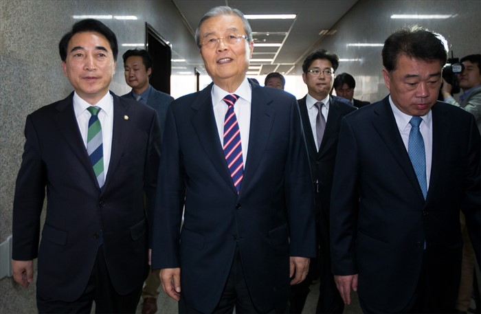 (서울=포커스뉴스) 20대 총선 비례대표 후보자 순번 등 논란으로 당무를 거부했던 김종인 더불어민주당 비대위 대표가 22일 오후 서울 여의도 국회에서 비공개 회의를 마친 뒤 이동하고 있다. 왼쪽부터 박수현 비서실장, 김 대표, 김성수 대변인.