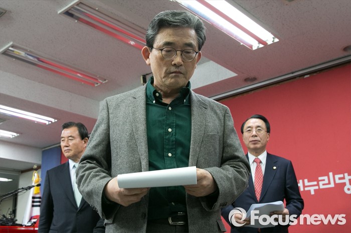 (서울=포커스뉴스) 이한구(가운데) 새누리당 공천관리위원장이 22일 오후 서울 여의도 당사 기자실에서 4.13 총선 비례대표 후보자 발표를 마친 뒤, 단상을 내려오고 있다.