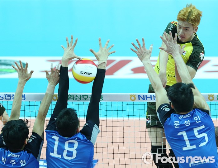 (안산=포커스뉴스) 22일 안산상록수체육관에서 열린 2015-2016 V-리그 남자부 챔피언결정전 3차전 OK저축은행-현대캐피탈 경기에서 OK저축은행 송명근이 현대캐피탈 박주형, 신영석의 블로킹을 뚫는 스파이크를 날리고 있다.