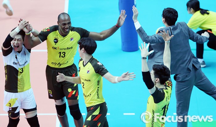 (안산=포커스뉴스) 22일 안산상록수체육관에서 열린 2015-2016 V-리그 남자부 챔피언결정전 3차전 OK저축은행-현대캐피탈 경기에서 1세트를 따낸 OK저축은행 선수들과 김세진 감독이 환호하고 있다.