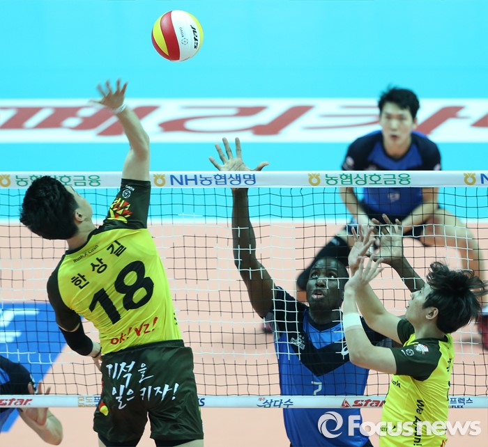 (안산=포커스뉴스) 22일 안산상록수체육관에서 열린 2015-2016 V-리그 남자부 챔피언결정전 3차전 OK저축은행-현대캐피탈 경기에서 OK저축은행 한상길이 세터 곽명우의 토스를 받아 속공을 시도하고 있다.