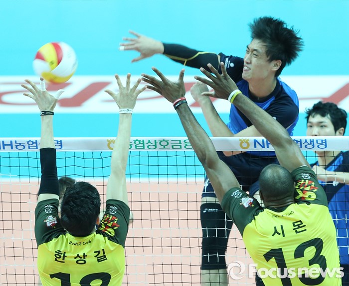 (안산=포커스뉴스) 22일 안산상록수체육관에서 열린 2015-2016 V-리그 남자부 챔피언결정전 3차전 OK저축은행-현대캐피탈 경기에서 현대캐피탈 진성태가 OK저축은행 한상길, 시몬의 블로킹을 피해 연타 공격을 하고 있다.
