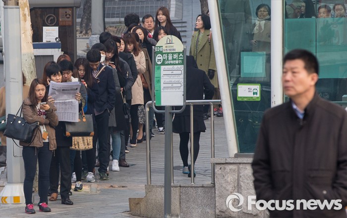 (서울=포커스뉴스) 꽃샘추위가 찾아온 23일 오전 서울 서초구 교대역 인근에서 두터운 옷차림의 시민들이 출근 버스를 기다리고 있다. 기상청은 오후부터 기온이 점차 떨어지겠고 바람도 약간 강하게 불어 쌀쌀하겠으니 건강관리에 유의할 것을 당부했다.