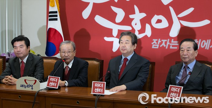 (서울=포커스뉴스) 강봉균(왼쪽 두번째) 새누리당 공동선대위원장이 23일 오전 서울 여의도 국회에서 열린 최고위원회의에 참석해, 발언하는 동안, 김무성(오른쪽 두번째) 대표, 원유철(왼쪽) 원내대표, 서청원 최고위원이 경청하고 있다.