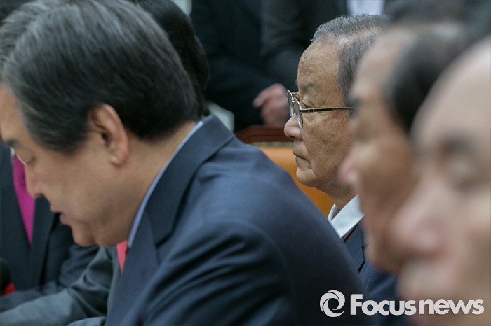 (서울=포커스뉴스) 김무성(왼쪽) 새누리당 대표가 23일 오전 서울 여의도 국회에서 열린 최고위원회의에 참석해 모두발언하는 동안, 강봉균(왼쪽 두번째) 공동선대위원장이 경청하고 있다.