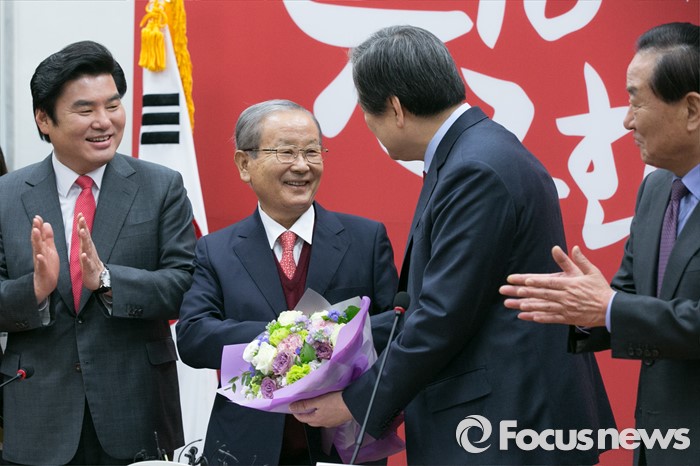(서울=포커스뉴스) 김무성(오른쪽 두번째) 새누리당 대표가 23일 오전 서울 여의도 국회에서 열린 최고위원회의에 참석해 강봉균(왼쪽 두번째) 공동선대위원장에게 꽃다발을 주며 악수하고 있다.