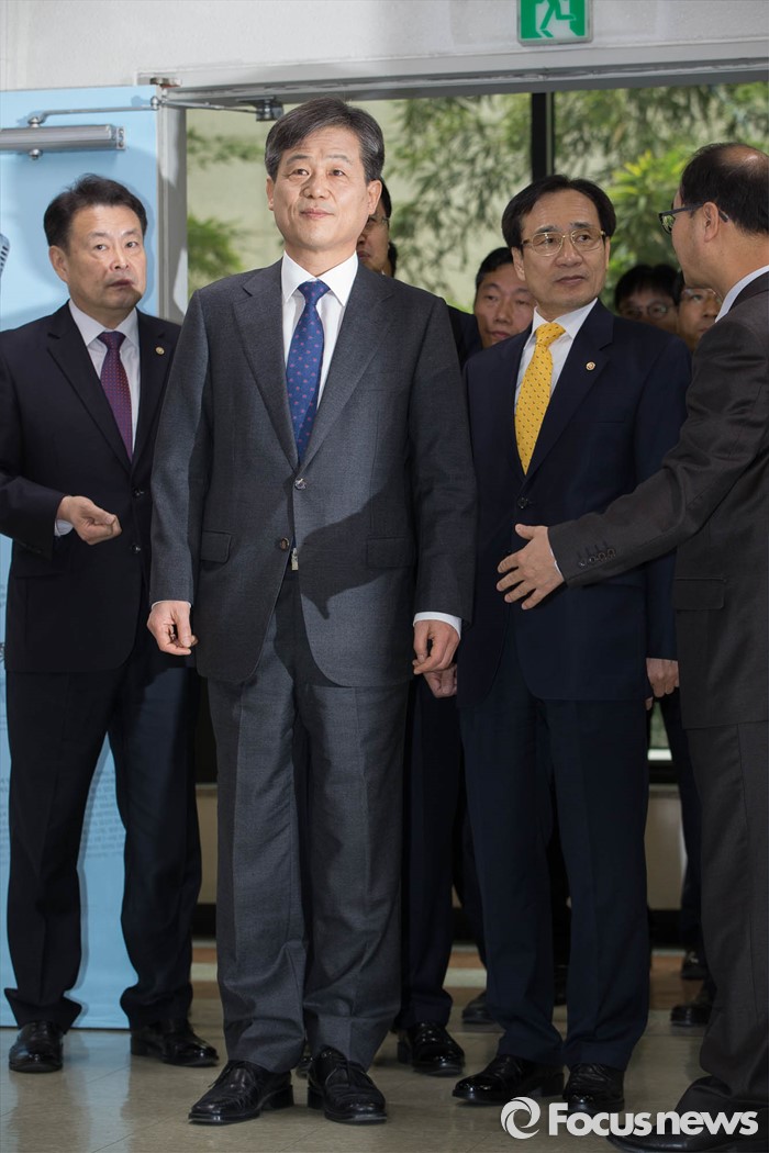 (과천=포커스뉴스) 20대 총선 후보자 등록을 앞둔 23일 오전 경기도 정부 과천 청사에서 이인복 중앙선거관리위원장이 공명선거 관련 대국민 담화문 발표에 앞서 관계자들과 이야기 하고 있다.