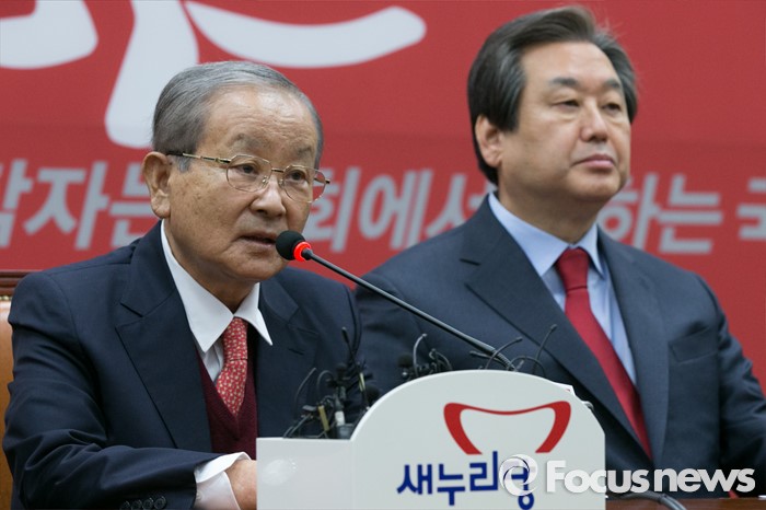 (서울=포커스뉴스) 강봉균(왼쪽) 새누리당 공동선대위원장이 23일 오전 서울 여의도 국회에서 열린 최고위원회의에 참석해, 발언하는 동안, 김무성 대표가 경청하고 있다.