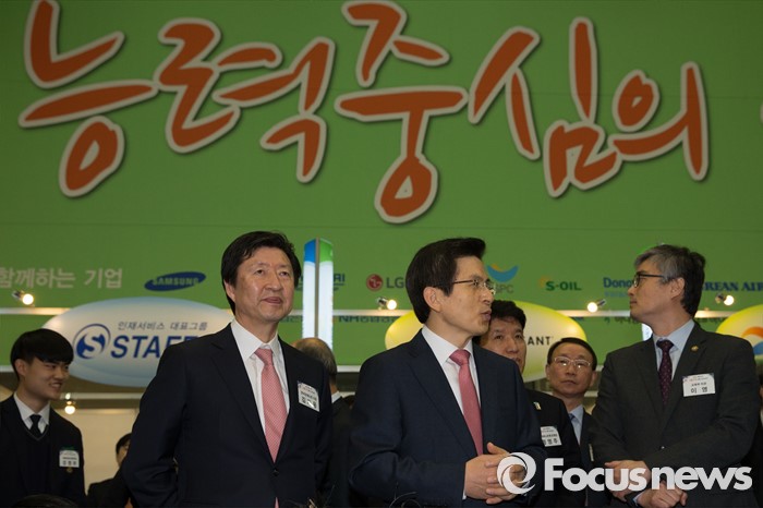 (고양=포커스뉴스) 23일 오전 경기도 고양시 킨텍스 제2전시장에서 열린 2016 대한민국 고졸인재 잡 콘서트(Job Concert)에서 황교안 국무총리가 참석해 방통대 부스 담당자에게 질문하고 있다.