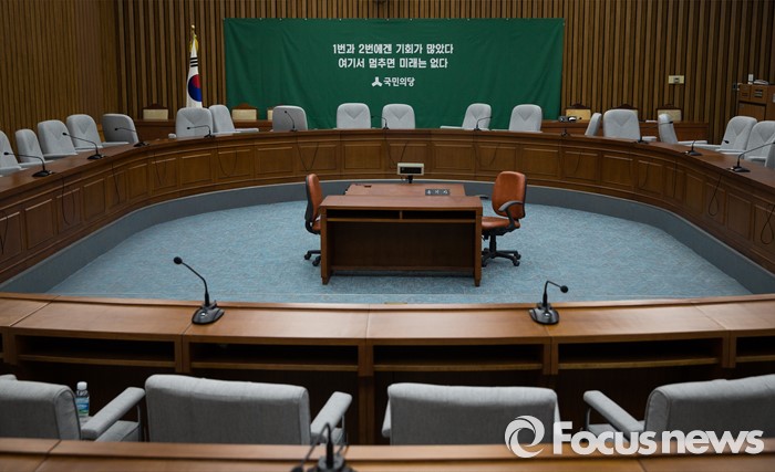 (서울=포커스뉴스) 국민의당이 23일 오전 10시 30분 서울 여의도 국회 본청 제 3회의실에서 후보 공천장 수여식을 열 예정이었으나 공천탈락 후 결선투표를 주장하고 있는 김승남 의원과 지지자들의 항의로 인해 행사 장소를 급히 당사로 옮겼다. 공천장 수여식이 열릴 예정이었던 국회 본청 회의실의 텅 빈 모습.
