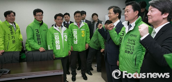 (서울=포커스뉴스) 안철수 국민의당 상임공동대표와 천정배 공동대표가 23일 오전 서울 마포구 당사에서 열린 20대 총선 공천장 수여식에 참석해 예비후보들과 기념촬영을 하고 있다. 국민의당은 이날 국회 본청에서 공천장 수여식 행사를 진행하려고 했지만, 공천에서 탈락한 김승남 의원 등 지지자들의 여론조사 관련 항의에 급하게 장소를 옮겨 진행했다.