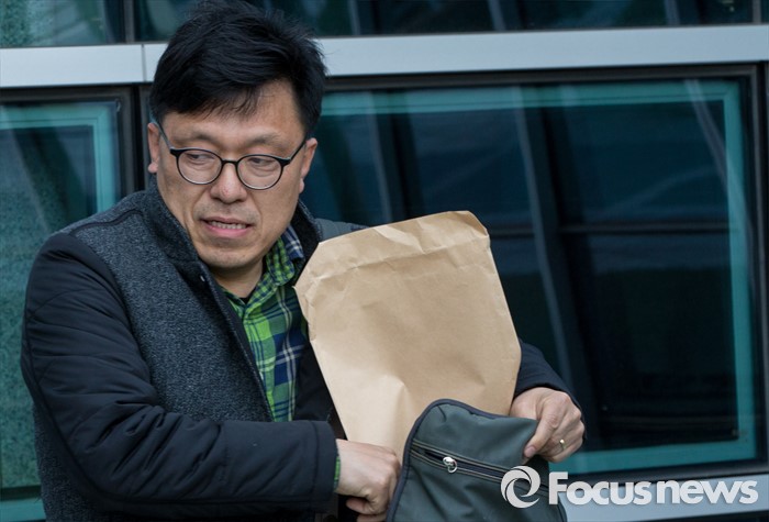 (서울=포커스뉴스) 23일 오후 서울행정법원 앞에서 열린 '청와대 상대 정보공개 소송 결과' 관련 기자회견에 참석한 하승수 녹색당 공동운영위원장이 가방에서 자료를 꺼내고 있다.